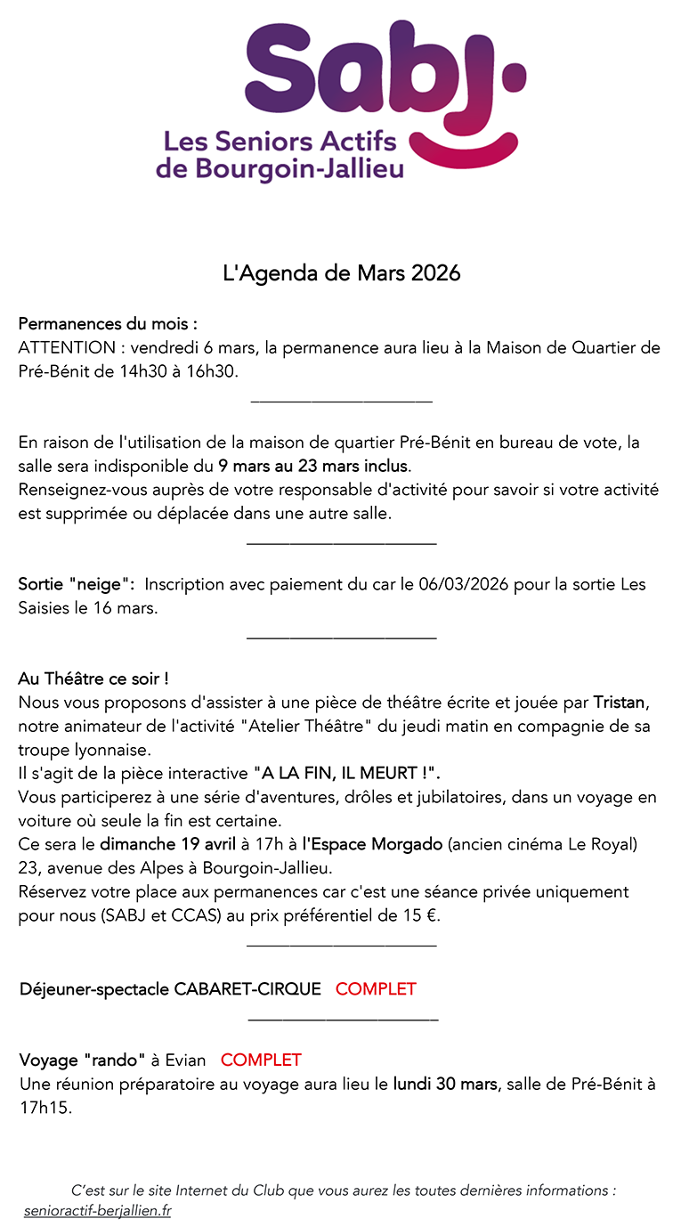 S. A. B. J. « Le Renouveau » 10bis, place Albert Schweitzer 38300 Bourgoin Jallieu - Tél. 04 74 43 26 09 -Mail : sabj38@orange.fr